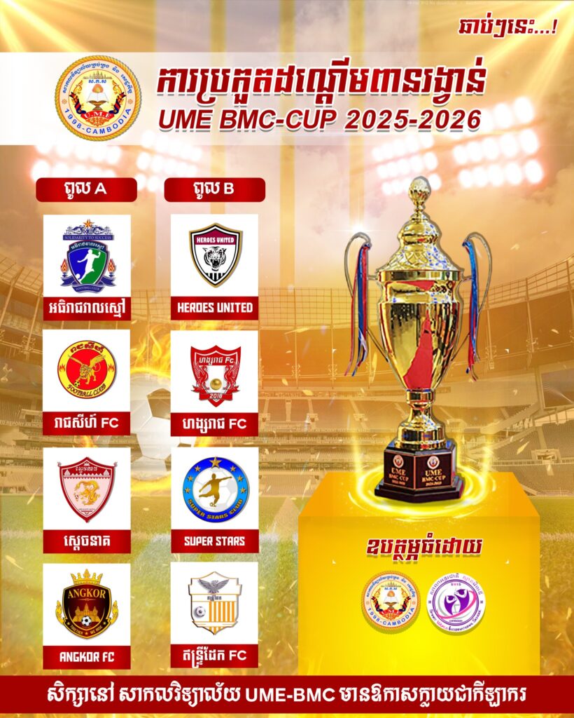 ការចាប់ពូល ប្រកួតបាល់ទាត់ដណ្ដើមពានរង្វាន់UME BMC-CUP 2025-2026សាកលវិទ្យាល័យគ្រប់គ្រង និង រសៀលថ្ងៃចន្ទ ១១កើត ខែមិគសិរ ឆ្នាំម្សាញ់ សប្តស័ក ពុទ្ធសករាជ ២៥៦៩សេដ្ឋកិច្ច (UME) ខេត្តបន្ទាយមានជ័យត្រូវនឹងថ្ងៃទី១ ខែធ្នូ ឆ្នាំ២០២៥